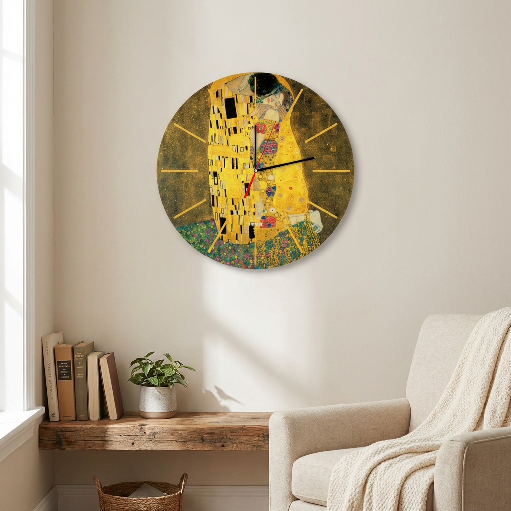 Zegar inspirowany motywem „Pocałunku” to połączenie sztuki, emocji i luksusu. Idealnie uzupełni eleganckie wnętrza, dodając im subtelnego blasku i artystycznej głębi.